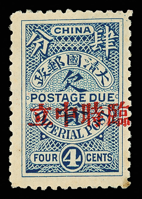 271 og imagePostage Due, 1912, Foochow "Provisional Neutrality" overprint, 4¢ blue (Chan D18. Scott J20), fresh with crisp color and detail, plus extra-wide margins, o.g., lightly hinged; discoloration at bottom right corner perforations, otherwise Very Fine, a lovely stamp. Scott $800 (HK$ 6,150). (Image1) (Image2) (All Images)