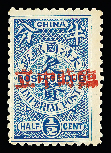 270 og imagePostage Due, 1912, Foochow "Provisional Neutrality" overprint, ½¢ blue (Chan D17. Scott J19), fresh with clean color and detail on bright paper, o.g., lightly hinged, Fine to Very Fine, signed JR Hughes. Scott $625 (HK$ 4,810). (Image1) (Image2) (All Images)