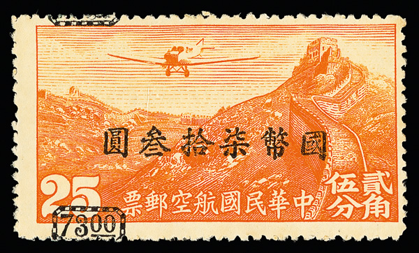 267 og imageAirmail, 1946, C.N.C. surcharge on Peking printing, $73 on 25¢ orange yellow, surcharge misplaced vertically (Chan A47a. Scott C42 var.), a lovely example in radiant color, showing a highly unusual downward shift of the surcharge, o.g., lightly hinged, Fine to Very Fine, a nice item for the Airmail enthusiast, signed Livingston & H.L. Chung. Scott $2,500 (HK$ 19,230). (Image1) (Image2) (All Images)