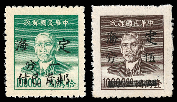 262 ng image1949, Silver Yuan, Ting Hai surcharges on Dr. Sun Yat-sen complete (Chan S197-S198), each an absolute beauty, wonderfully fresh with strong color on pristine paper, #S198 perfectly centered in proof-like detail, without gum as issued, Very Fine, rare, both signed JR Hughes. (Image1) (Image2) (All Images)