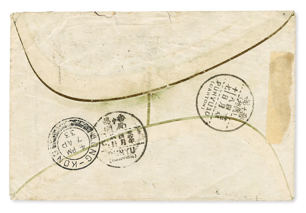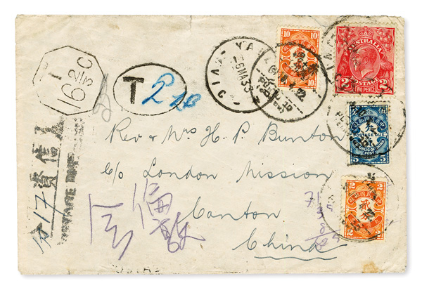 306 cover image1933 (Mar. 6), Incoming Postage Due cover, from Australia to Canton, franked by 2d red King George V tied by one of two Victoria postmarks (town indistinct), with three Postage Due handstamps including Chinese noting 17c due, paid by blue 5c (Peking Print) and orange 2c and 10c Postage Due singles (#J55, J61, J64) tied by bilingual "Punyu 10/(Canton)" postmarks (Apr. 10); reverse bears Hong Kong transit (Apr. 7) and "Punyu 10" and "Punyu" receivers (Apr. 8); usual edge wear, Fine to Very Fine, ex "Sunrise Collection". (Image1) (Image2) (All Images)