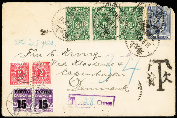 309 cover image1936 (Feb. 21), Postage Due cover from Shanghai to Copenhagen, franked by 2c horizontal strip of three and single 20c "New Life" issue, tied by four strikes of bilingual Shanghai dotted-rim cancel, with bold bilingual "T" and violet boxed "T [28] Ctmes" Postage Due handstamps, and Danish 2ø and 15ø on 12ø Postage Due pairs cancelled Mar. 16, 1936 (dates difficult), Fine to Very Fine, ex "Sunrise Collection". (Image1) (Image2) (All Images)