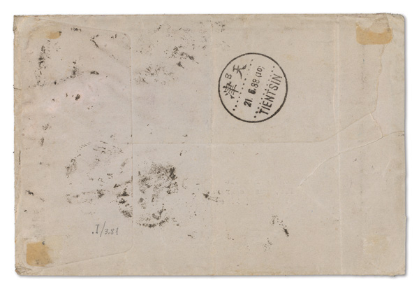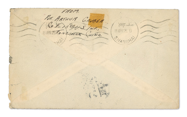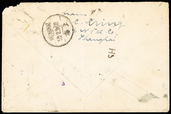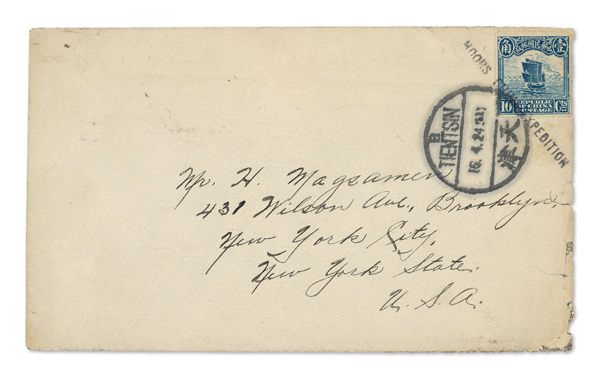 303 cover image1924 (Apr. 16), "Moors China Expedition" cover from Tientsin to New York, 10c Junk tied by both "B/Tientsin" bilingual postmark and by straightline "MOORS CHINA EXPEDITION" handstamp; reverse with return address of a private in Co. F, 15th US Infantry at Tongshan plus bilingual Shanghai roller transit of Apr. 18, 1925; the 15th US Infantry was stationed in Tientsin, patrolling the area and protecting the local communities from the warring armies during the Chinese Civil War; a clean strike of this uncommon marking, Fine to Very Fine. (Image1) (Image2) (All Images)
