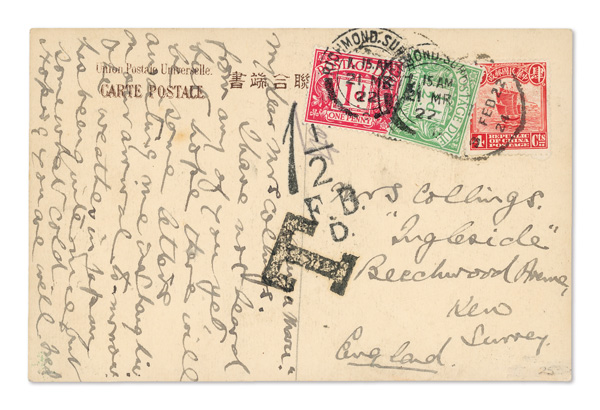 302 cover image1924 (Feb. 22), Postage Due picture post card from China to Kew, England, interesting Japanese card, written aboard the Kasuga Maru the day before her arrival in Shanghai, franked with 4c Junk tied by "Feb. 22/24" postmark (city obscured), addressed to Kew, Surrey, England; Bold British "T" "1½" and "F.B./D." due handstamps, the additional postage paid by British ½d and 1d Postage Due adhesives cancelled "Richmond, Surrey/21 MR/22", Very Fine, ex "Sunrise Collection". (Image1) (Image2) (All Images)