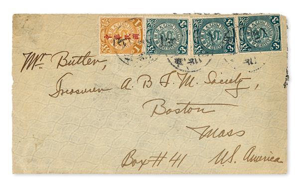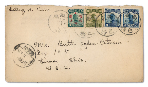 300 cover imageChina, Select Group of Four Covers Originating in "Batang, W. China", 1920s-47, comprising three Junk issue-franked covers to Lima, Ohio, with typed or manuscript "Batang W. China" in corner, plus a 1947 use from "Paan (Batang), Sikang (Chinese Tibet)" via Kanting to New Zealand, Fine to Very Fine or better, a scarce group to be sure, ex "Sunrise Collection". (PDF for this Lot) (Image1)