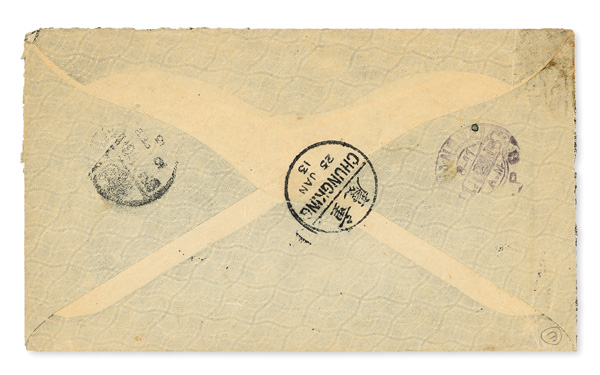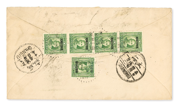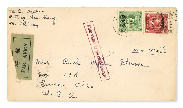 310 cover image1936 (Mar. 31), Airmail cover from "Batang, Hsi-Kang, W. China" to Ohio, US, scarce, lovely cover franked on front by 20c Szechwan Province-overprinted Martyr (#20) plus 5c Sun Yat-sen overprint, a further five 5c stamps (including vertical strip of four) on reverse; all cancelled by Kangting bilinguals c.d.s.'s; front shows boxed violet "Airmail service in China only" handstamp, while reverse notes Chengtu (Apr. 7) and Shanghai (date unclear) transits, Very Fine, scarce use, ex "Sunrise Collection". (Image1) (Image2) (All Images)