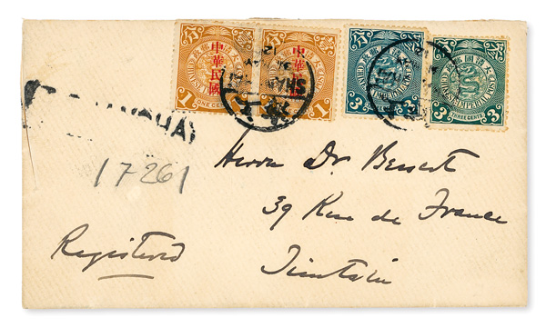 295 cover image1912-13, Lovely pair of "Republic"-overprint and Coiling Dragon covers, comprising a choice Registered cover, Shanghai to Tientsin, franked by two 1c Statistical Department "Republic" overprints (#147) plus two unoverprinted 3c values, all tied by May 31, 1922 c.d.s.'s; second cover from Chungking to the US with Jan. 25, 1913 bilingual c.d.s., Shanghai I.J.P.O. transit and Shanghai bilingual Feb. 10 receiver; nice use pair, Very Fine, ex "Sunrise Collection". (Image1) (Image2) (Image3) (Image4) (All Images)