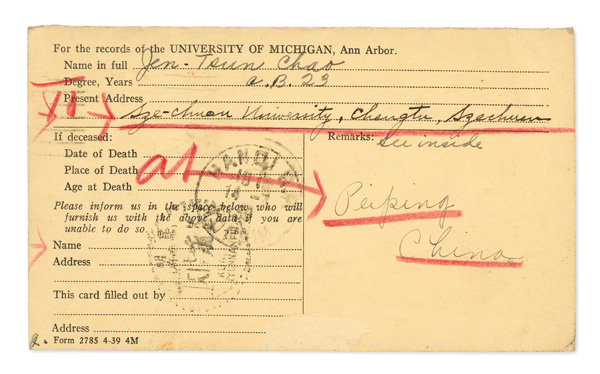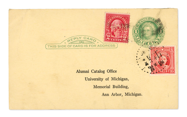 311 cover image1939 (July 11), Reply Card from Kunming to Ann Arbor, Michigan, US 1¢ green Martha Washington Reply Card, uprated by "U of M"-perfined 2¢ Washington, Chinese postage paid by 15c Second London Print Sun Yat-sen tied by dotted-rimmed bilingual Kunming cancel; reverse with second Kunming strike and "Hanoi R.F." July 14 transit; card wrinkled at top left (not affecting stamps or markings), still a nice multicolor use, Fine to Very Fine. (Image1) (Image2) (All Images)