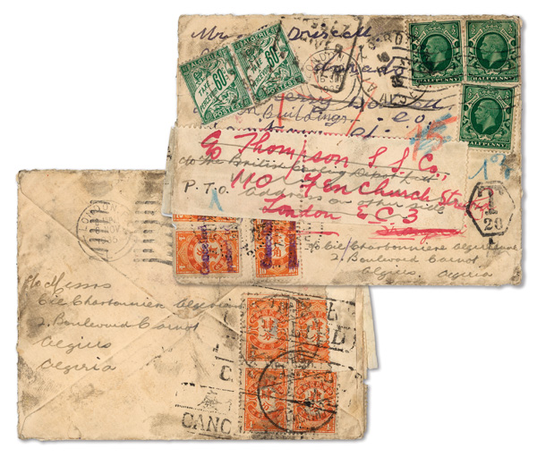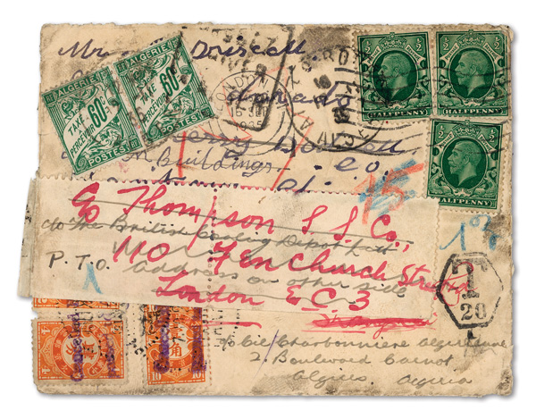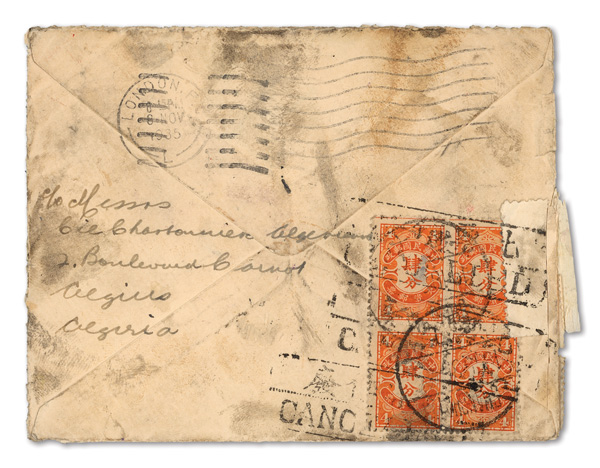 308 cover image1935 (Sept. 16), Remarkable well-traveled cover from London to Hankow, forwarded to Shanghai and onwards to Algiers, a striking cover, short-paid in London and originally charged 16c Postage Due in Hankow on Oct. 7, then sent back to London with reverse showing 16c Postage Due paid by 4c orange block of four cancelled Shanghai Oct. 19; cover readdressed to Algiers, Algeria, where two 60c Postage Dues were added on Nov. 12; cover opened for display, Fine to Very Fine, quite possibly a unique combination, ex "Sunrise Collection". (Image1) (Image2) (Image3) (All Images)
