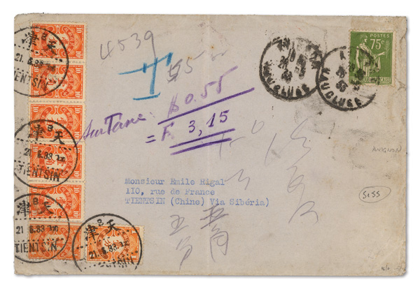 307 cover image1933 (May 26), Incoming Postage Due cover from France to Tientsin, bearing French 75c definitive tied by one of two "Avignon/Vaucluse" smudged postmarks, assessed 55c Postage Due in Tientsin, paid by 10c (single and two pairs), 4c and 1c Chinese adhesives (#J59, J62, J64) tied by four crisp strikes of Tientsin June 21 bilingual postmarks; all stamps bright and sound, the cover with inconsequential vertical file fold, Fine to Very Fine, a nice bi-color cover, ex "Sunrise Collection". (Image1) (Image2) (All Images)