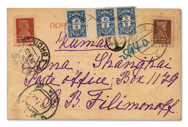 304 cover image1925 (June 27), Incoming Postage Due post card from Russia to Shanghai, franked at right by 7k Worker with striking foreign matter printing flaw, tied by partially obscured cancel, and at left by 3k Worker cancelled next-day in Leningrad; circled-"T" Due handstamp, the shortage paid by interpane strip of three Chinese 2c Postage Dues (#J53), amazingly sound given placement across top, Fine to Very Fine, ex "Sunrise Collection". (Image1) (Image2) (All Images)