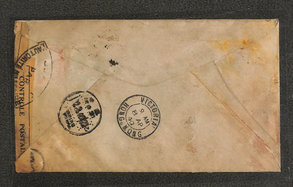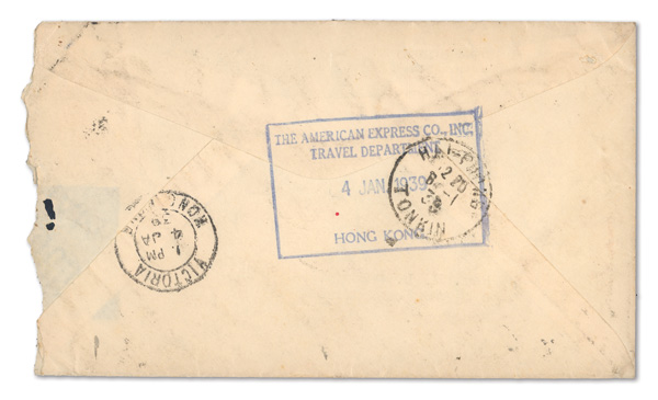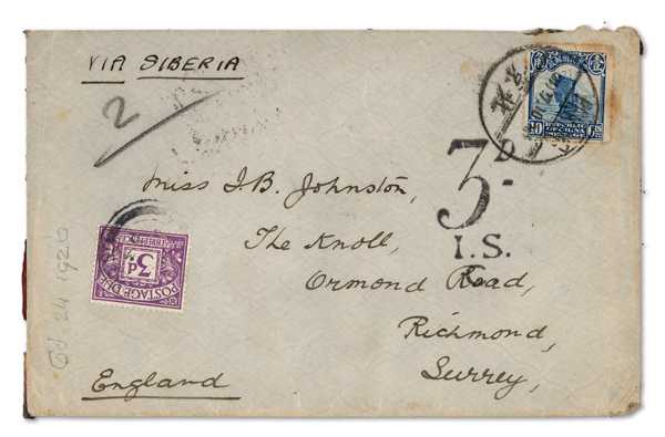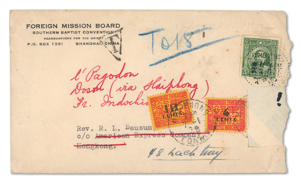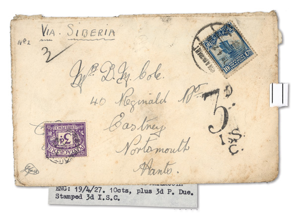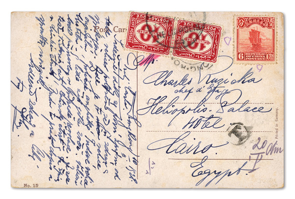 299 cover imageca. 1920-39, Quartet of short-paid Chinese covers abroad, each with the receiving country's Postage Due adhesives; the first a picture post card to Egypt, franked by 6c Junk with two 10m Postage Dues cancelled Heliopolis; the second an Oct. 24, 1920 cover from Peking to Richmond, Surrey, franked by 10c Junk with 3d Postage Due and "3d/I.S./C" handstamp; the third a 10c Junk-franked cover from Shanghai to Portsmouth, England with similar handstamp and adhesive; the fourth a cover from Shanghai to Hong Kong forwarded to Doson, French Indochina, franked by 5c Sun Yat-sen Nov. 29, 1938 with 4c and 1c Postage Dues cancelled Jan. 7, 1939 at Tonkin, the reverse with Hong Kong Jan. 4 handstamp and postmark and Hai-Phong Jan. 8 receiver; condition varies, the last cover with one stamp removed, but still a neat little group, generally Fine to Very Fine, ex "Sunrise Collection". (Image1) (Image2) (Image3) (Image4) (Image5) (Image6) (Image7) (Image8) (All Images)