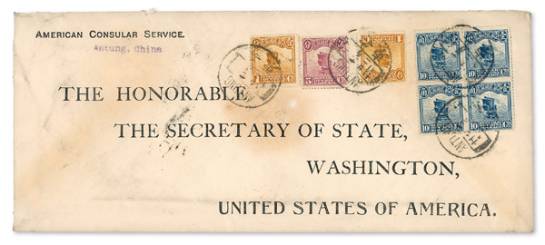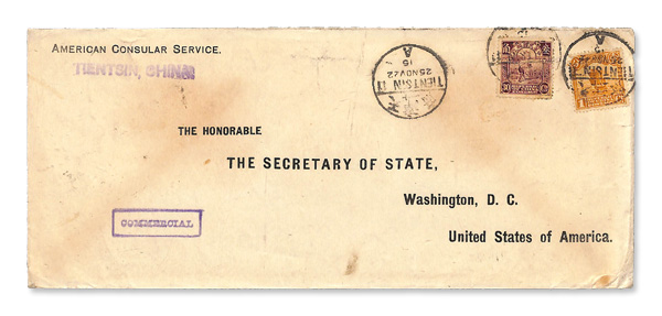 298 cover imageca. 1915, Two American Consular Service covers to Washington, DC, oversized linen "American Consular Service" corner card envelopes, each with printed address to the Secretary of State; the first from Antung, franked 1c (2), 5c and 10c (block of four) First Peking Print Junks, all tied by Antung bilingual cancels (Nov. 22, year unclear); the second from Tientsin with boxed "Commercial" handstamp in violet, franked 1c and 30c First Peking Print Junks, tied by two of three bilingual Nov. 25, 1922 cancels; some toning to each, stamps unaffected, Fine to Very Fine. (Image1) (Image2) (Image3) (Image4) (All Images)
