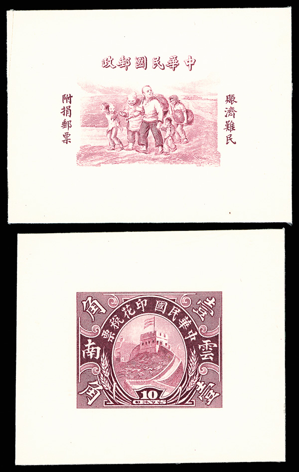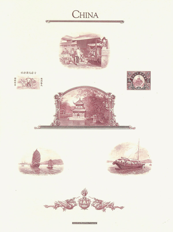 293 og imageca. 1944, American Bank Note Company Samples Page, on cream card measuring approximately 215 x 286 mm, seven different engraved images in plum, comprising street scene, pagoda on lake, two ships, dragons and pearl, plus actual vignette for 1944 War Refugees Semi-Postals and 10c Great Wall Revenue stamp; engravings bright and crisp; page pristine, Very Fine, an attractive collateral item. (Image1)