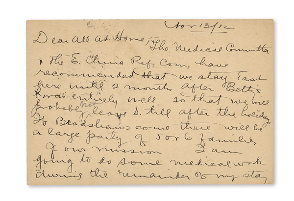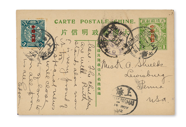 297 O image1912 (Nov. 13), "Republic"-overprinted CIP 1c green postal card, from Shanghai to Lewisburg, PA, divided-back card, uprated by Statistical Dept.-overprinted 3c Coiling Dragon with "Shanghai 7" bilingual Nov. 13 postmarks tying stamp and canceling indicium; Shanghai foreign bilingual dater (Nov. 14) and Shanghai I.J.P.O. (Nov. 15) as well, the latter partially masked by a third Shanghai origin postmark; correspondence from a medical worker, Fine to Very Fine. (Image1) (Image2) (All Images)