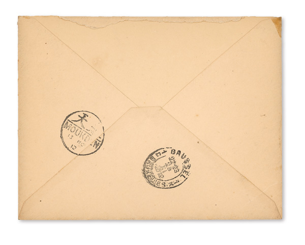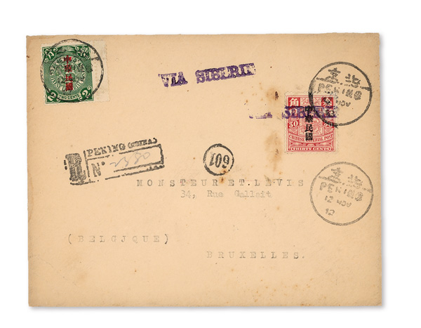 296 cover image1912 (Nov. 12), Registered cover from Peking to Brussels, Belgium, franked by 2c and 30c Statistical Office "Republic"-overprinted Coiling Dragons (the 2c with interpane selvage at right), each tied by bilingual Peking postmark with third strike at lower right; two strikes of violet "Via Siberie" straightline handstamps, one further tying the 30c stamp; Peking Registry handstamp at left; reverse with bilingual Moukden transit (Nov. 13) and Brussels receiver (Nov. 25); missing backflap, Fine to Very Fine, an appealing first year cover. (Image1) (Image2) (All Images)