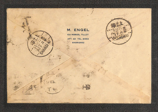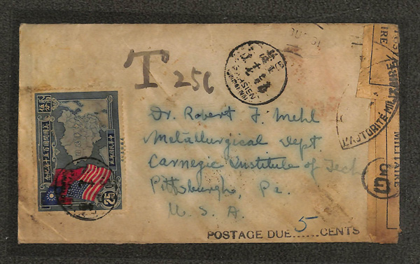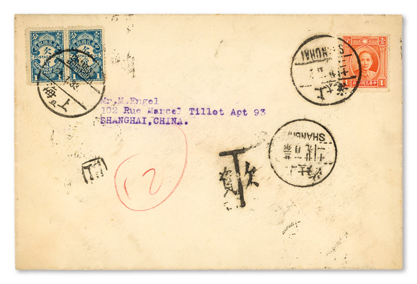 305 cover image1933-40, Pair of Postage Due covers, domestic and foreign, the first a cover sent locally within Shanghai, franked 1c orange red Sun Yat-sen tied by Jan. 29, 1933 postmark with Chinese "T" Due handstamp and horizontal pair of 1c blue Dues tied by same-day western-dated bilingual postmark, the reverse with two next-day Shanghai receivers; the second a censored cover from Pahsien to Pittsburgh, PA, franked 25c US Constitution Sesquicentenary single, with French censor tape and handstamp at left, US "Postage Due [5] cents" handstamp at bottom; "Victoria/Hong Kong" transit of Apr. 8, 1940; latter water-logged with US Postage Due missing; still an interesting duo, Fine to Very Fine. (Image1) (Image2) (Image3) (Image4) (All Images)