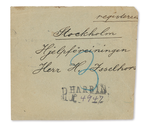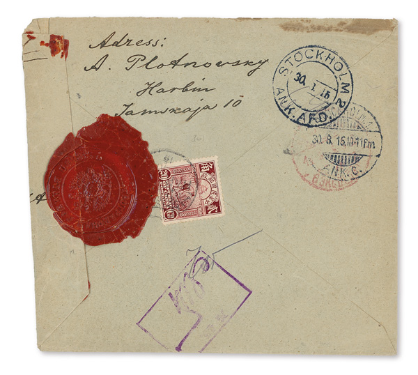 301 cover image1923 (Aug.), Censored Registered cover from Harbin to Stockholm, Sweden, franked on reverse by 20c Second Peking Print Reaper tied by indistinct circular datestamp and Petrograd War Censor's red wax seal, the reverse additionally showing a violet boxed censor's handstamp, indistinct Russian red transit and two Stockholm receivers (Aug. 30); address side with boxed "R/Harbin/No. [4947]" Registry handstamp; cover complete but shortened at right due to censor's resealing (not reduced), Fine to Very Fine. (Image1) (Image2) (All Images)