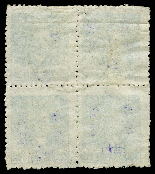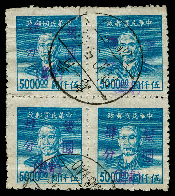 362 Obl image1949, Silver Yuan, Tsingtao surcharge on Dr. Sun Yat-sen, 4¢ on $5,000 turquoise blue (Chan S200. Scott 2), block of 4, fresh and sound with radiant color and neat Tsingtao bilingual cancels of 10.5.49, Very Fine, ex "Sunrise Collection". Scott $360 as singles (HK$ 2,770). (Image1) (Image2) (All Images)