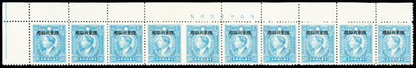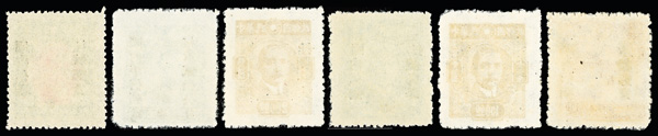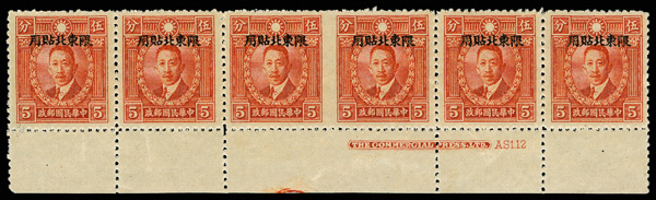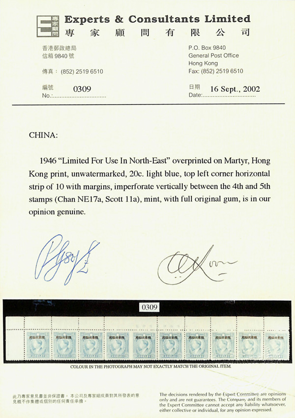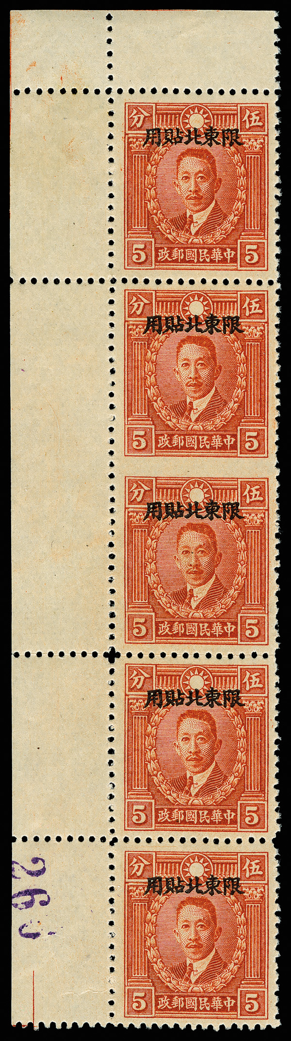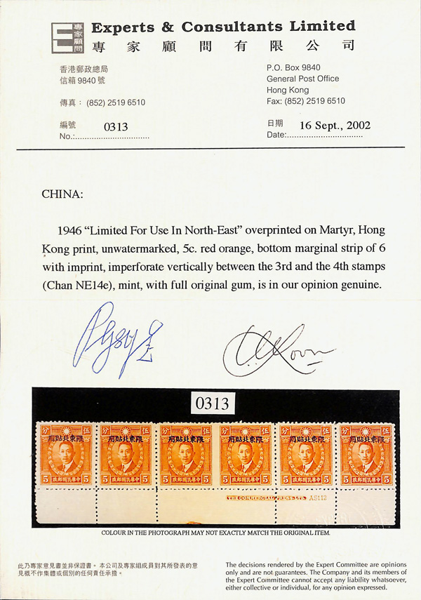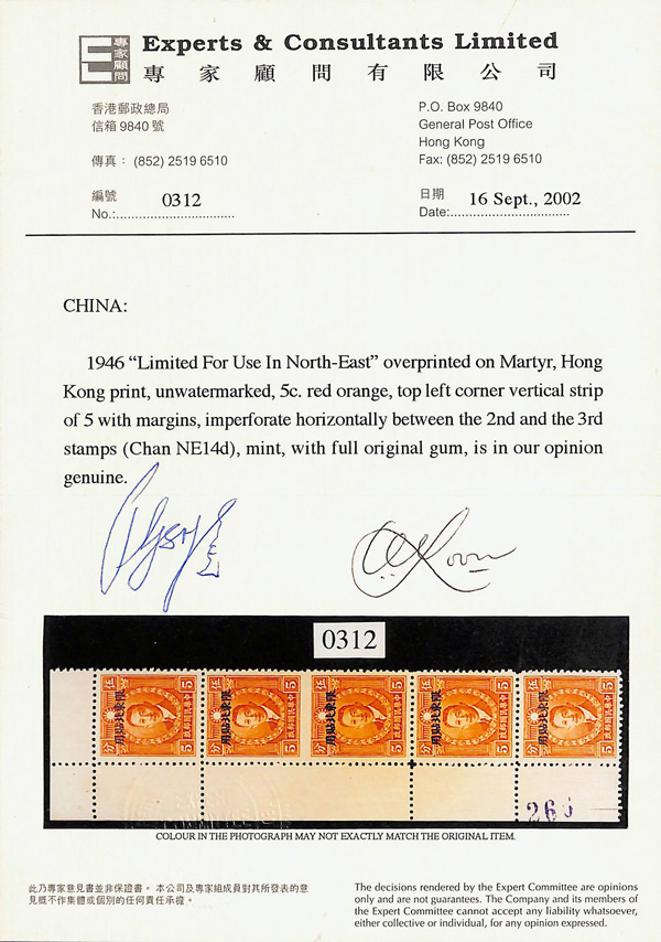 352 nh image1946, 5c Martyr, Hong Kong Print, "Limited for Use in North-East" surcharge, horizontal pair, imperforate between (Chan NE14e. Scott 8 var.), the middle pair in a bottom margin imprint strip of six, with exceptional color and clarity, o.g., never hinged, Very Fine and very scarce, ex "Sunrise Collection", with 2002 Experts & Consultants Ltd. certificate. (Image1) (Image2) (Image3) (All Images)