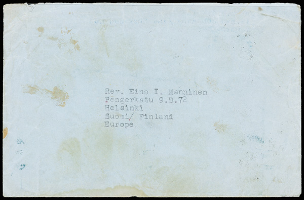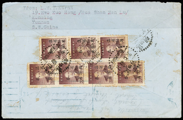 363 cover image1949 (June 28), Cover from Kunming to Helsinki, franked on reverse by vertical strips of three and four 30c on $20 Yunnan Provincial surcharge (Scott #68), tied by three of four Kunming c.d.s.'s; very faint receiver, Fine to Very Fine, scarce use, ex "Sunrise Collection". (Image1) (Image2) (All Images)