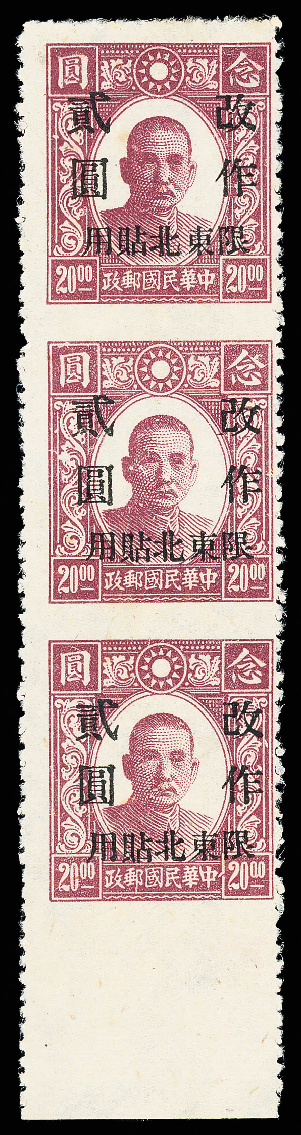 350 ng image1946, $2 on $20 Sin Min Print Sun Yat-sen, newsprint, imperforate between and at bottom margin (Chan NE4 var. Scott 4 var.), bottom margin vertical strip of three, with intense color and bright paper, without gum as issued, Very Fine, a scarce and unlisted variety, ex "Sunrise Collection". (Image1) (Image2) (All Images)