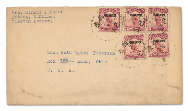 355 cover image1935 (Jan. 13), Cover from "Batang, W. China, Tibetan Border" to Ohio, lovely cover franked by five copies of 5c Szechwan Province overprinted Junk (#2), cancelled by Xikang, Ba'an c.d.s.'s, the reverse with smudged bilingual transit appearing to read "Batang/Pahsien", Very Fine, a scarce, rarely encountered use, ex "Sunrise Collection". (Image1) (Image2) (All Images)