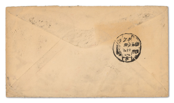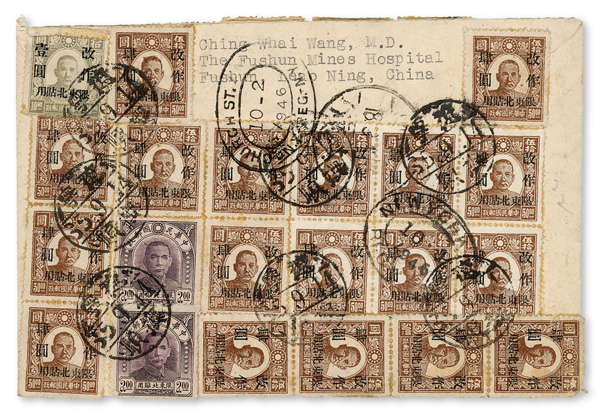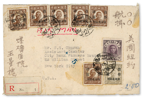 348 cover image1946 (Sept. 14), Registered Airmail cover from Fushun to New York, eye-catching cover with $104 postage (covering the back as well), from a doctor at the Fushun Mines Hospital to a New York City bank cashier; franked by North East Provinces #3 (2), 5 (24) and 18 (3), all cancelled by "Liaoning/35.9.14/Fushun" cancels, with Registry label (No. 1 (!)) at lower left; reverse with double-oval New York (Oct. 1) and Church St. (Oct. 2) Registry receivers; an appealing Provincial cover, Fine to Very Fine. (Image1) (Image2) (All Images)