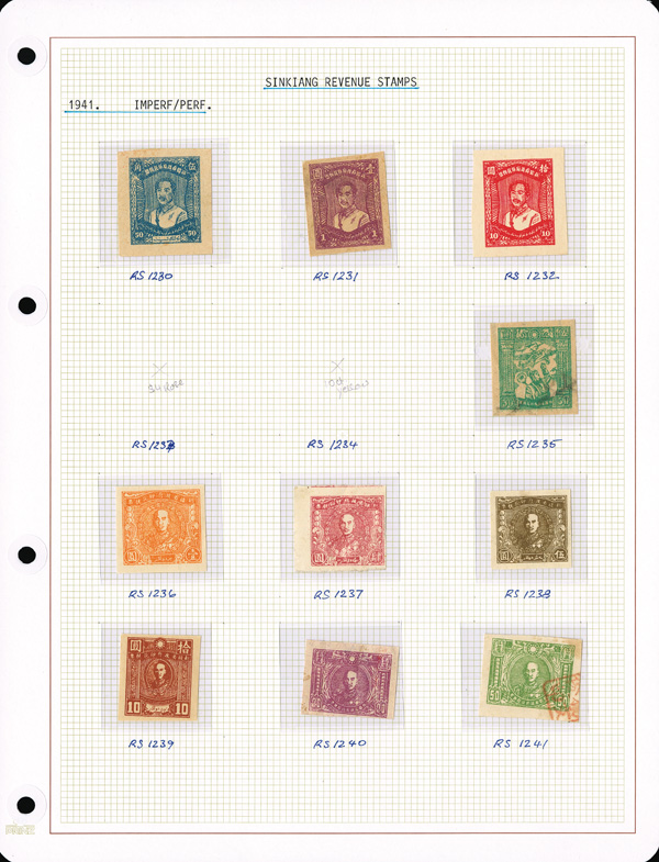 354 imageSinkiang, Fabulous Collection of Used & Unused Revenues, 1940-58, Tucked away in the extreme northwest corner of China, Xinjiang is the largest province of the PRC. This specialized collection looks just at the revenues and is presented on quadrille pages and annotated in English with each item in a clear mount. Includes approximately 100 used/unused stamps, fifteen additional blocks and a few on document, overall Fine to Very Fine, viewable in its entirety online. Shipping charges apply - weight 3 lbs. (Video for this lot) (Image1)