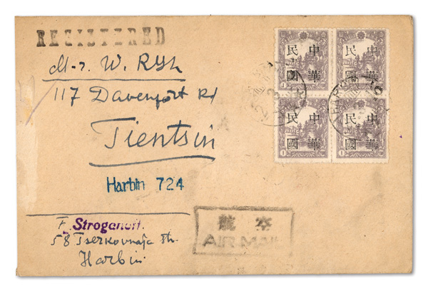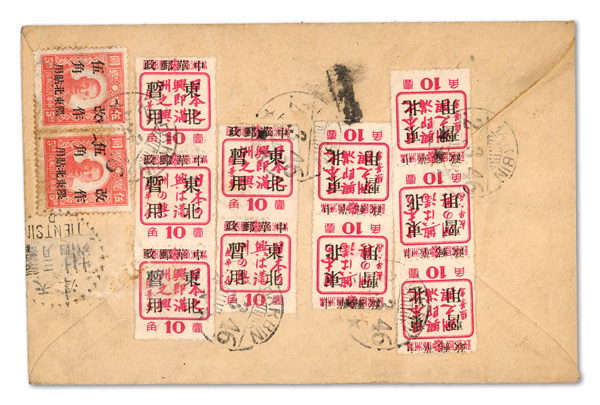 347 cover image1946 (Feb. 2), MLO-franked Airmail cover from Harbin to Tientsin, bearing on front Changchun local machine overprint 1y lilac block of four, and on back "Limited for Use in North-East" overprint 50c on $5 red horizontal pair with Changchun local overprint on Friendship with Japan 10f vertical strips of three and pairs, two of each (Chan NE1, MOKR.2C.6, Kerr13.14-5), canceled by "Harbin" bilingual c.d.s., a Very Fine and appealing franking. (Image1) (Image2) (Image3) (All Images)