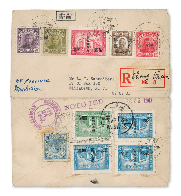 349 cover image1947 (Jan. 10), Registered cover from Changchun to New Jersey, opened for exhibition, an attractive multicolor franking comprising Sun Yat-sens (normal and surcharged) and surcharged National Assembly issues (Scott #5, 17-18, 23-24, 26, 27 (3) and 29), all tied by dotted-rimmed bilingual Changchun postmarks (10.1.36); boxed manuscript "Registered" endorsement above stamps on front, with Registry label below (city added by hand); reverse with Shanghai and New York transits (dates unclear) and Elizabeth, NJ receiver (Feb. 24) along with straightline "Notified" and "Feb 25 1947" handstamps; an attractive item, Fine to Very Fine. (Image1) (Image2) (All Images)
