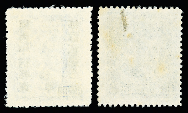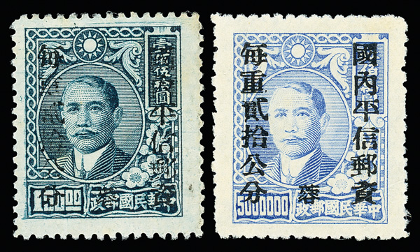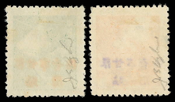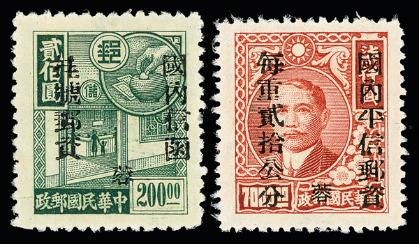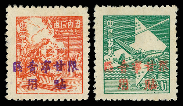 346 ng image1949, Domestic Ordinary and Airmail Unit Stamps, Dah Tung Print, handstamped "Limited For Use in Kan-Ning-Tsing District" (Chan S68, S69. Scott 1, C1), both fresh with clean impression and large margins, overprints clearly struck, without gum as issued, Very Fine, rare and seldom offered, each signed JR Hughes. Scott $2,200 (HK$ 16,920). (Image1) (Image2) (All Images)