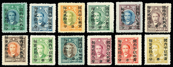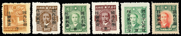 359 ng image1949, Unit Stamps, West Szechwan "Domestic Registered" overprints, $100-$5,000 complete (Chan SR1-SR8. Scott F1-F8), clean and sound with bright colors and solid centering, without gum as issued, Very Fine. Scott $1,010 (HK$ 7,770). (Image1) (Image2) (Image3) (Image4) (All Images)