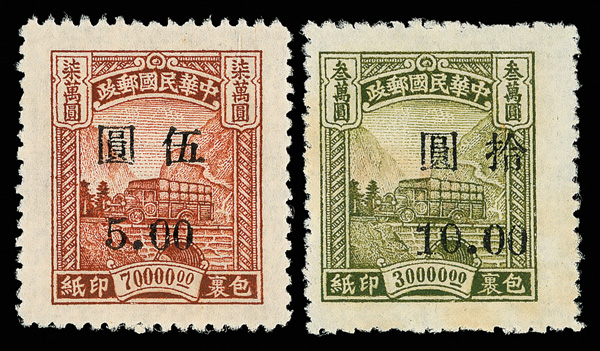 345 ng image1949, Silver Yuan, Hunan surcharges on Parcel Post complete (Chan SP1-SP7), all pristine with rich, vibrant color on fresh paper, sound and well centered amid large margins, without gum as issued, Very Fine, a lovely and rare set. (Image1) (Image2) (Image3) (Image4) (All Images)