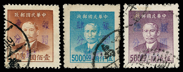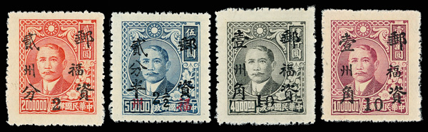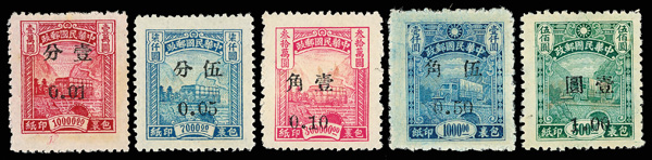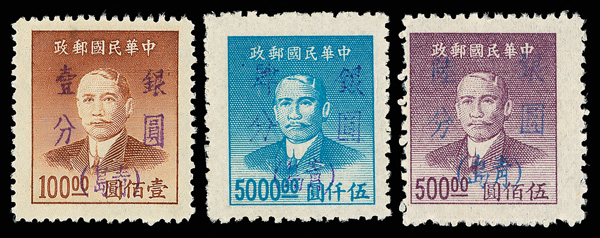 344 ng image1949, "Foochow" overprint on Fukien Silver Yuan Stamps, 1c on $500 to 10c on $1,000,000 complete (Chan S192-S196. Scott 19-23), fresh with strong color on clean, sound paper, each well centered, without gum as issued, Very Fine. Scott $478 (HK$ 3,680). (Image1) (Image2) (Image3) (Image4) (All Images)