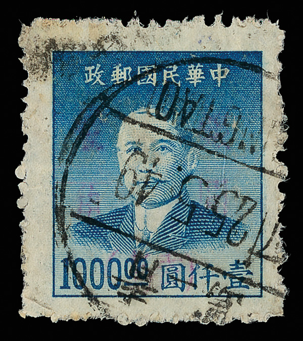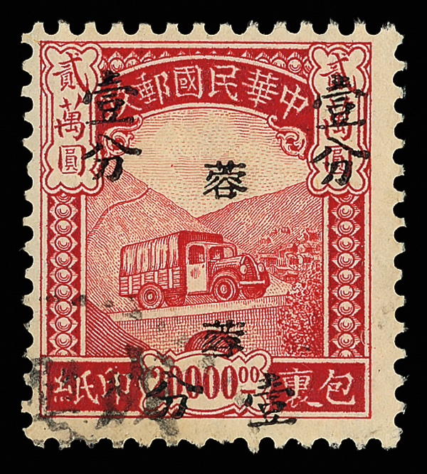 358 O image1949, West Szechwan District Post Office, 1c on $20,000 dull red London Print Parcel Post stamp (Chan SP18. Scott Q1), with robust color and crisp detail, "used" (CTO) as usual, with clean gum faintly hinged, Very Fine, scarce; unpriced (dashed) in Scott. (Image1) (Image2) (All Images)