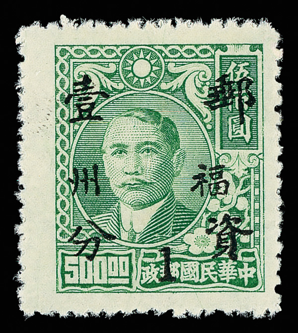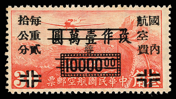 357 nh image1949, Unit Stamp, West Szechwan "Domestic Airmail" overprint, $10,000 on 30¢ red, watermarked (2000 Chan SA3. Scott C1a), pristine with sumptuous, rich color and bold, clean surcharge; sound with immaculate gum, o.g., never hinged, Very Fine, unpriced mint in Scott (used $500), rare. (Image1) (Image2) (All Images)