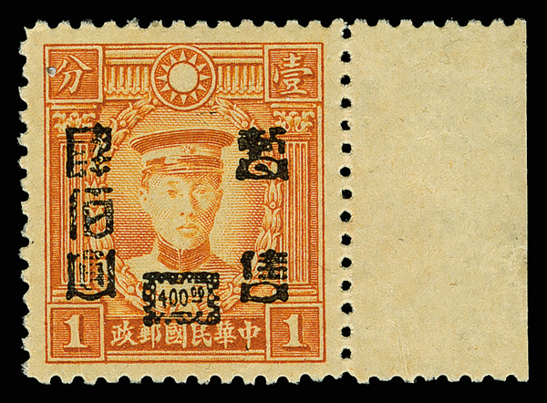 378 og image1945, $400 on 1¢ orange Martyr with secret mark, unwatermarked, surcharged in black (Scott 1N59), right margin single, Post Office fresh with enticing color and mathematical centering, dryish o.g. as always, Very Fine, ex "Sunrise Collection". (Image1) (Image2) (All Images)