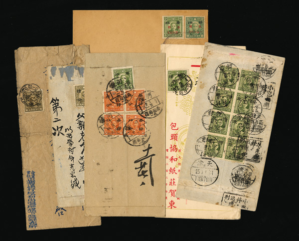 377 imageJapanese Occupation of China, Postal History Selection, lovely group of six, comprising five nice covers and an unaddressed, commemorative-cancelled cover; domestically used covers show a nice array of frankings, origins, cancels, etc.; a great specialist group, largely Fine to Very Fine, inspection invited; fully imaged online, ex "Sunrise Collection". (PDF for this Lot) (Image1)
