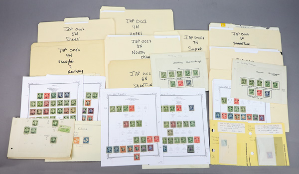 376 imageJapanese Occupation of China, Nicely Organized Mint and Used Collection, 1931-45, a lovely collection, arranged in Scott area order, on a mix of pages, each region in its own folder with items first on Scott-ordered pages followed by homemade quadrille pages arranged by Ma; nicely filled and mostly mint with various pairs and larger blocks sprinkled in, along with a number of used items; better includes (Scott number, mint, unless noted) #1N23-1N32 (1N26 with 2008 Sismondo certificate), 1N57-1N58 (2); 2N9-2N18, 2N24-2N28, Ma #NC560-568; 3N55-3N60; 4N24-4N33, 4N32-4N33, Ma #NC1-9 (mixed mint and used); 5N1-5N4; 6N23-6N29, Ma #NC379-386; 7N15a, 7N55-7N57, 7N60; 8N5-8N9, 8N17-8N22, unissued Kalgan Print 50c & $1 perforated, etc.; total catalogue value (2020 Scott plus 1998 Ma) over US$13,750 per consignor; a pretty lot well worth review, generally Very Fine, fully imaged online. Shipping charges apply - weight 3.2 lbs. (PDF2 for this Lot) (Image1)