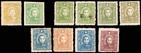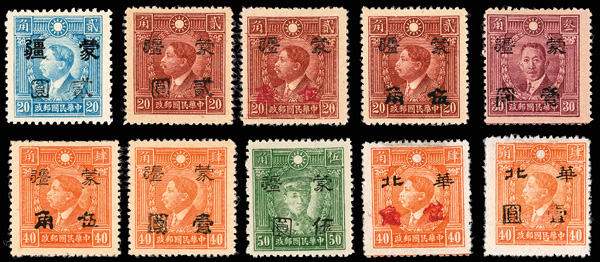 380 imageMengkiang, Collection of Unissued and Unauthorized Overprints, 1945, a neat little holding for the specialist, bright and fresh, comprising 22 different surcharges on Mengkiang (20) or North China (2) overprints, ranging from $1 on 2c (facial scuff) to $1 on 40c, most all unauthorized according to Chan; plus a group of ten Chan #JMUA//JMU13 including varieties such as #JMUA perforated/rouletted (Chan lists only as imperforate), 50c on 5c #JMU6 (possibly unauthorized), etc.; fresh and clean with the exception of the one noted above, with o.g. hinged to varying degrees; worth review, Fine to Very Fine with much better, fully imaged online. (Image1) (Image2) (Image3) (Image4) (Image5) (Image6) (All Images)