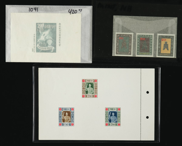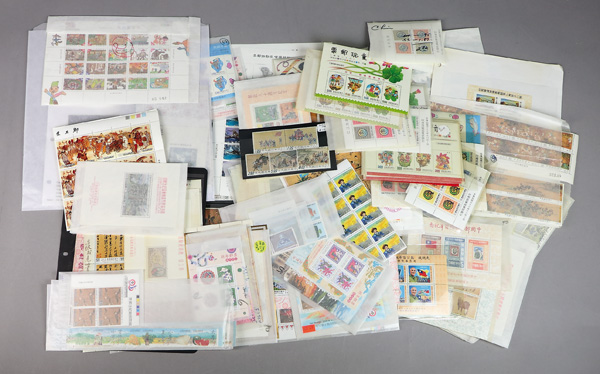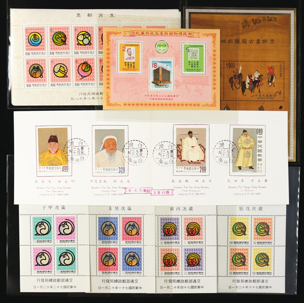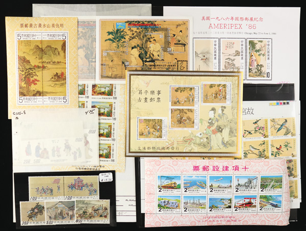 442 imageTaiwan, Substantial Mint Horde of Mostly Souvenir Sheets, a bright and clean array of material, Post Office fresh and apparently sound, the items ranging from classic to modern; among the earlier issues we note #1041, 1095a (2), 1114a with tab, 1126a with tab (light internal wrinkle), 1135-1136 (2), and 1257a (2); modern includes se-tenants and souvenir/miniature sheets in useful quantities, #1344 Specimen, complete sets, numerous imprint items, a souvenir sheet or two with gold stamp show overprint, along with a trio of $1-$5 Postal Savings stamps, etc., etc.; a boon for the busy online or bourse dealer, Very Fine, see samplings online, ex "Sunrise Collection". Shipping charges apply - weight 2.6 lbs. (Image1) (Image2) (Image3) (Image4) (Image5) (Image6) (Image7) (Image8) (All Images)