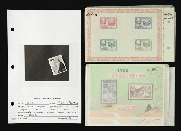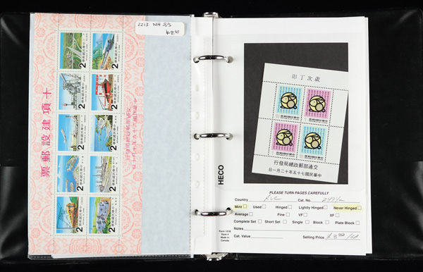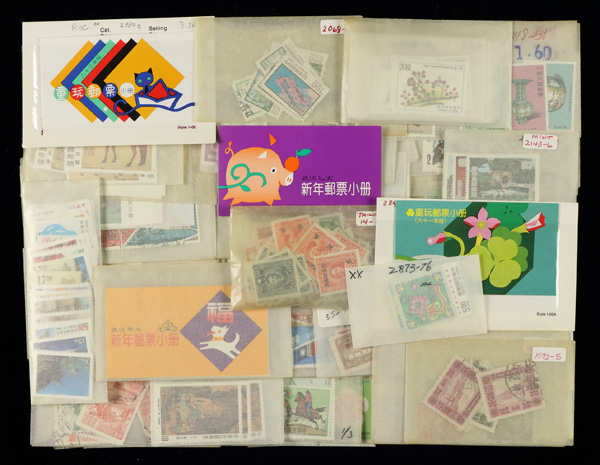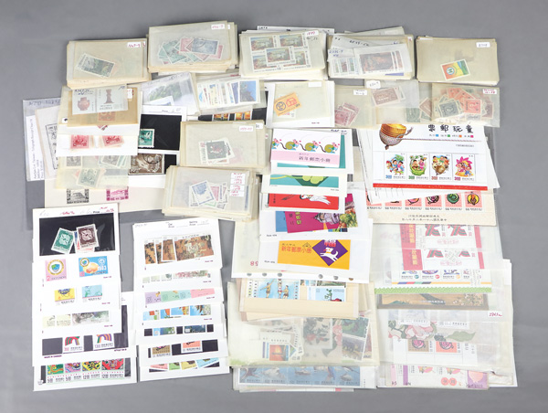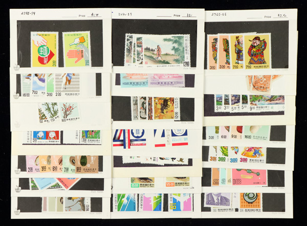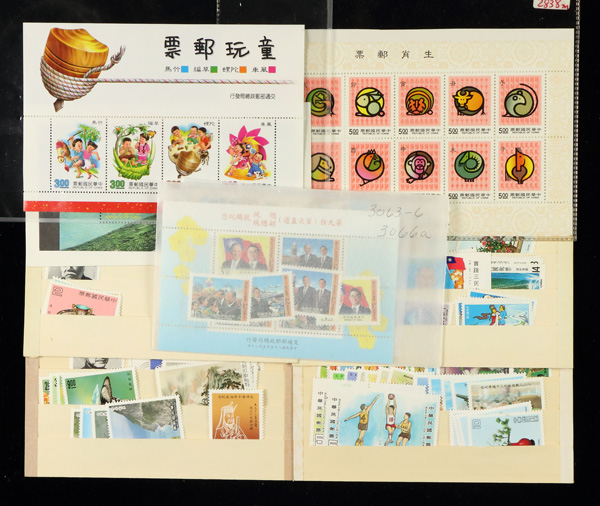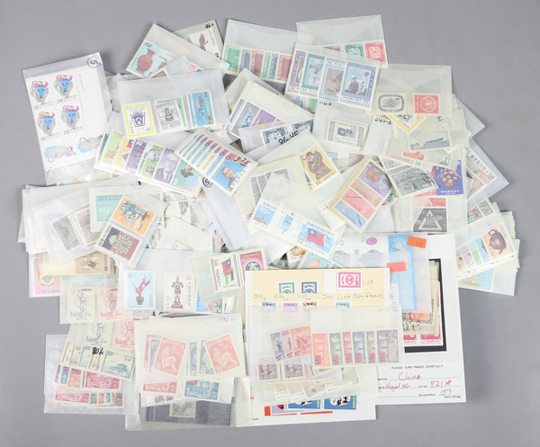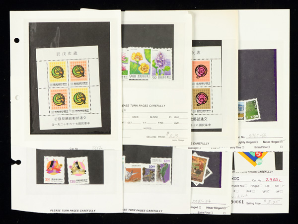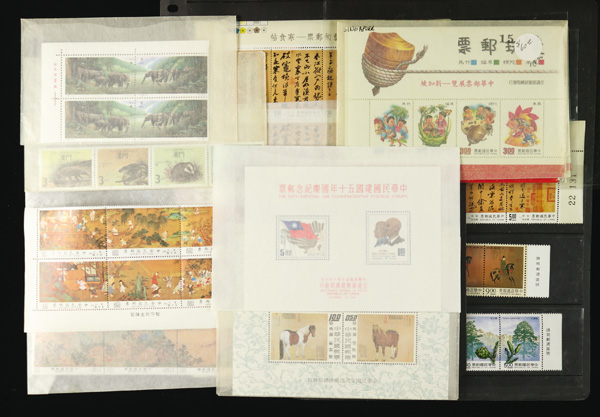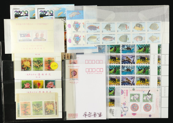 444 imageTaiwan, Substantial All-Mint Holding, thousands of stamps in glassines, on dealer pages and black cards, etc., fresh and bright with massive retail potential; useful duplication including booklets, souvenir sheets, larger blocks and part-sheets, complete sets, etc., etc.; a gold mine for the busy dealer (or the dealer who wants to be busy), with a large proportion of material being more recent issues so rarely found; Post Office fresh throughout, though expect a very occasional small fault or two, Very Fine, inspection invited; see a sampling online, ex "Sunrise Collection". Shipping charges apply - weight 5.6 lbs. (PDF for this Lot) (Image1)