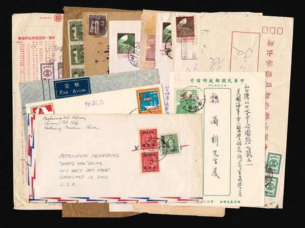 450 imageTaiwan, Diverse Postal History Selection, ca. 1945-89, lovely range of 12 items including a nice group of six domestic Postage Due covers; two early Taiwan Province covers, one from Nantou to Taipei franked by 10s (#3) and 1¥ strip of three (#7), the second from Taoyuan to Taipei franked by a single 40s (#5), a couple nice ca. 1948-49 overprinted covers, etc., bulk generally Fine to Very Fine, a nice group; fully imaged online, ex "Sunrise Collection". (PDF for this Lot) (Image1)