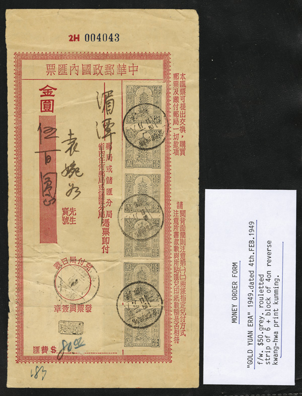 446 imageTaiwan, "Easy Money" Money Order Stamps on Forms, 1949-64, A dozen money order forms, each with multiples of the Baoen Pagoda issue and a wide variety of overprints for use in Taiwan, overall Fine to Very Fine, viewable in its entirety online. (PDF for this Lot) (Image1)