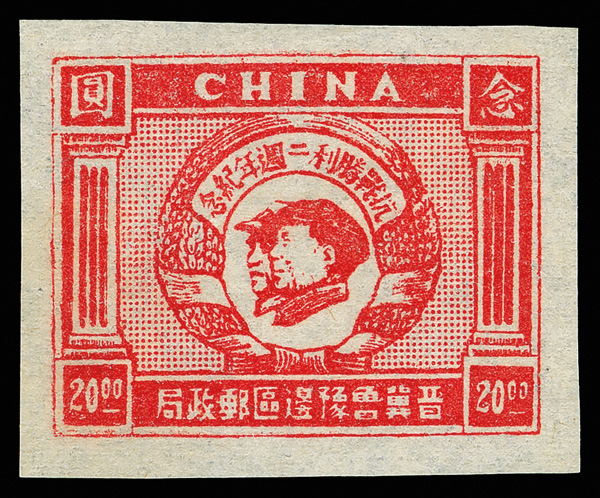 464 ng image1947, Shanxi-Hebei-Shandong-Henan Border Area, Second Anniversary of Victory Over Japan, $20 rose red, rough perf (Yang NC241a), immaculate with bold, rich color, without gum as issued, Very Fine. (Image1) (Image2) (All Images)