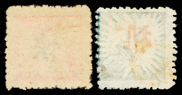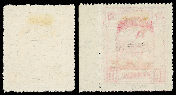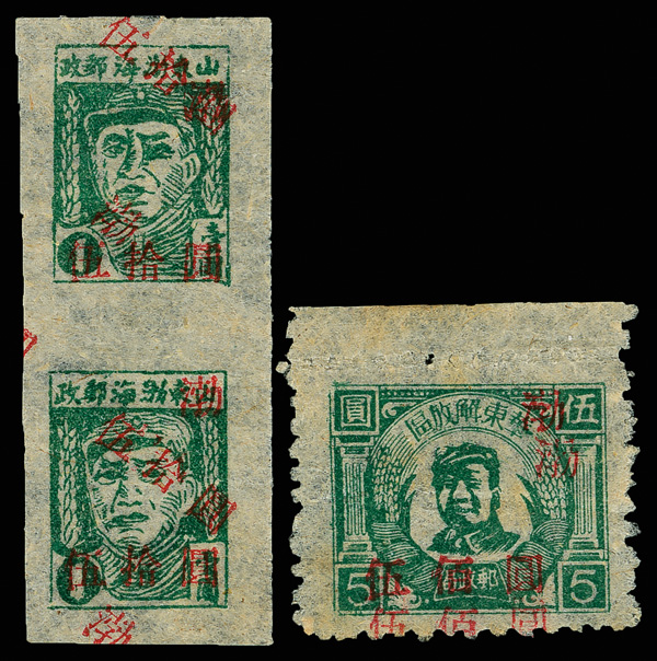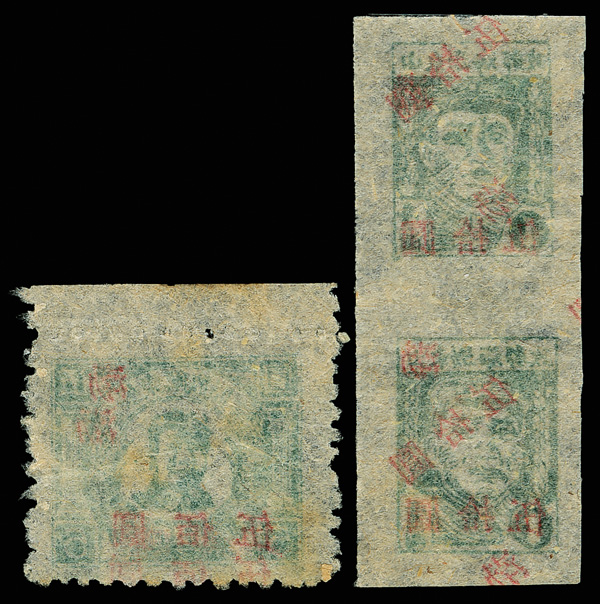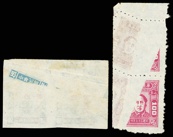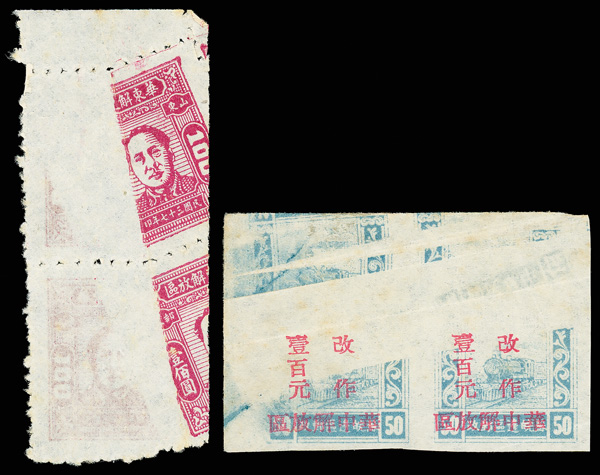 467 ng image1948, "Shandong Liberated Area", Chairman Mao, Qingzhou 2nd printing, $100 lilac rose & Su-Peh Machine surcharge with new value (Yang EC147 var., EC342 var.), each a pair, the former (Yang EC147, Scott 5L2) vertical, the latter horizontal, each showing dramatic pre-printing paper folds, without gum as issued, Very Fine, striking and scarce, ex "Sunrise Collection". (Image1) (Image2) (All Images)