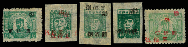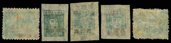 468 ng image1947-49, Bohai Post Chairman Mao & Chu Teh, surcharge varieties (Yang EC183//EC190), group of seven different, the surcharges mostly doubled or misplaced, some askew, etc., fresh with a range of shades on clean paper, without gum as issued, generally Very Fine, a scarce assembly and interesting, ex "Sunrise Collection". (Image1) (Image2) (Image3) (Image4) (All Images)