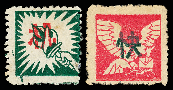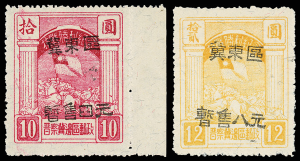 459 ng image1946, Ki Tung (East Hebei) Area, hand surcharges on large Victory issue complete (Yang NC85-86), pristine with bright colors on matching paper, the $4 on $10 a right margin single, without gum as issued, Very Fine, ex "Sunrise Collection". (Image1) (Image2) (All Images)
