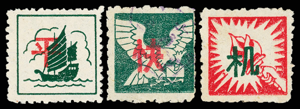 470 og/O image1942 (Nov.), Su-Chung First "Unit Issue" with no value indicated, five different (Yang EC252-254, 256-257), set complete less green overprint on red Junk issue, exquisitely bright and fresh, #EC254 (red overprint on green Pigeon) used, otherwise mint, without gum as issued, Very Fine, scarce, ex "Sunrise Collection". (Image1) (Image2) (Image3) (Image4) (All Images)
